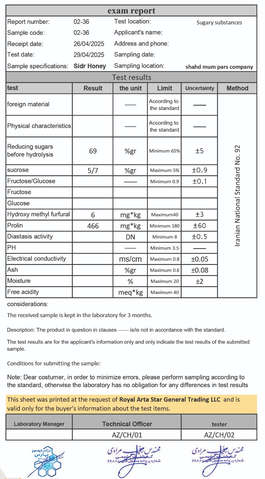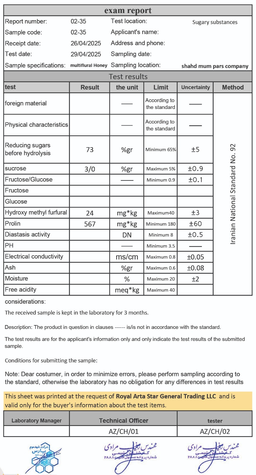 جدیدترین آنالیزهای عسل های موجود مهکام
